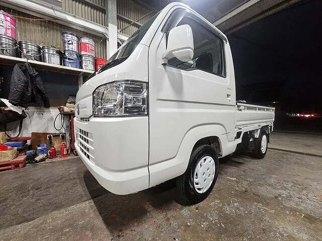 夜の整備工場に、ピカとライトを灯したアクティトラックが静かに佇んでいます。